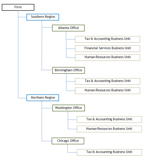 Organizational units define your organizational structure. The structure can consist of multiple levels: firm, region, office, and business unit. If regions are used, at least one office must exist in each region. At least one business unit must exist in each office. for your firm and a default system administrator