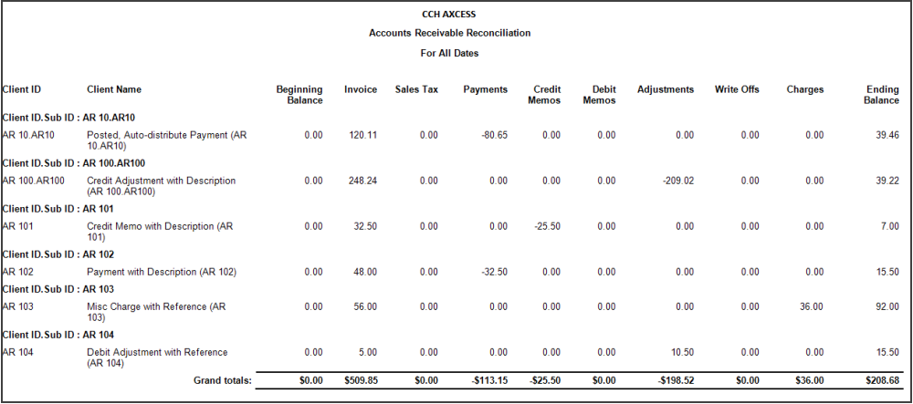 The Accounts Receivable Reconciliation report lists the AR activity for a given time period, showing a beginning AR balance for each client as of the start date of the report and detailed AR activity for the period entered. The report includes activity types for each client. This report can be used to reconcile accounts receivable activity for the period.