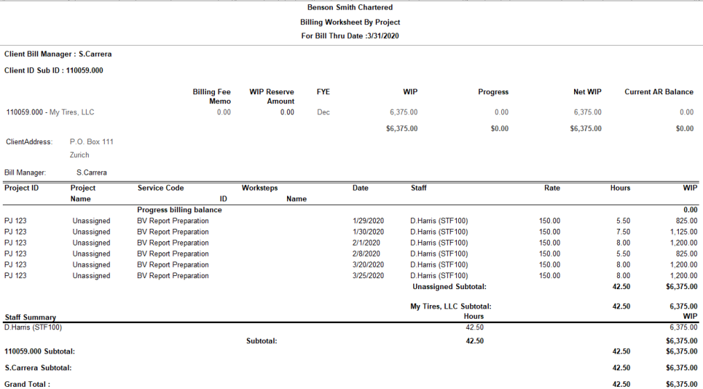 | Subtotal for section | The subtotal for Project. The columns that are totaled are Cost, Hours, Billed, and Adjust. |