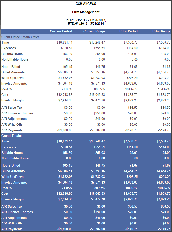 The Firm Management report shows the firm’s productivity, summarizing current and prior PTD/RTD for WIP and AR activity that can be reviewed by management.