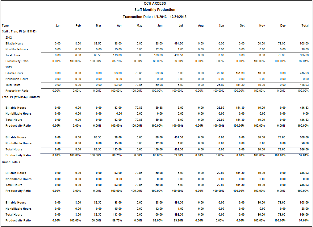 The Staff Monthly Production report compares each staff’s current-year and prior-year production hours or amounts by month.