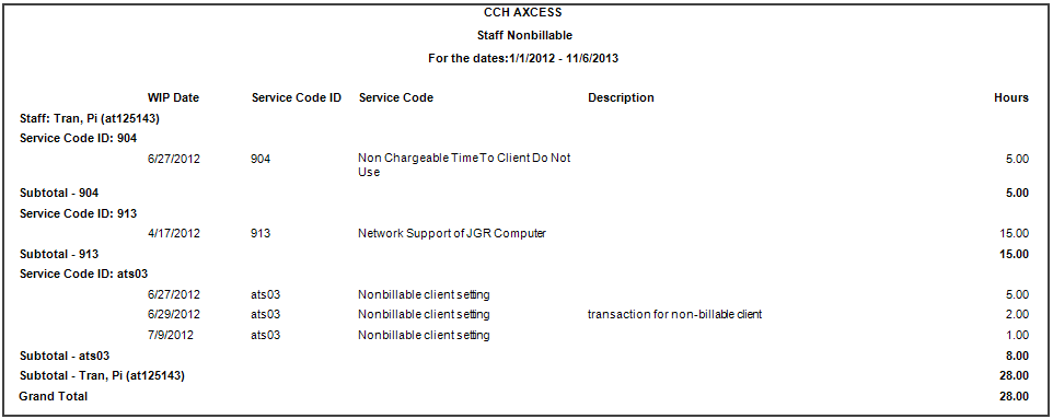 The Staff Nonbillable report displays nonbillable hours by staff.