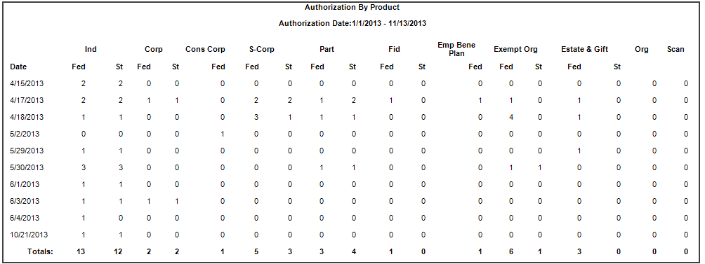 The Authorization By Product report shows the number of authorizations processed for each authorization type within a specified time period. The number of Organizer and Scan authorizations is also included in the report.
