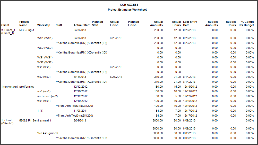 The Project Estimates Worksheet report provides details regarding project estimate dates and hours as well as budget and actual amounts to help you keep projects on track. Managers can use this report to review project planned versus actual dates and hours for clients. This report can also include estimates.