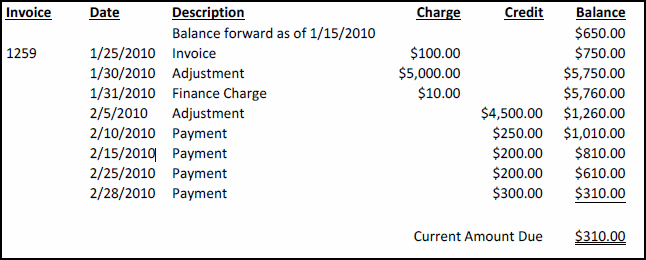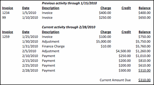 Using the open item AR statement template will include invoices, payments, and other transactions are displayed as separate items if they are not fully distributed. Previous activity and current activity will be grouped separately on the statement.